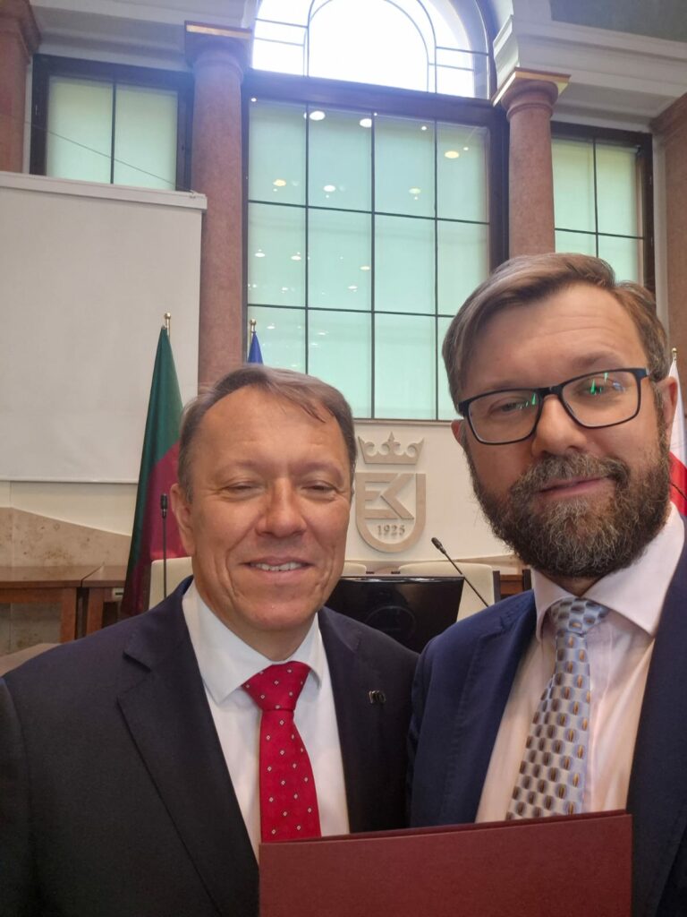 Rektor Uniwersytetu Ekonomicznego w Krakowie dr hab. Bernard Ziębicki, Prof. UEK oraz nagrodzony dr Sebastian Brańka