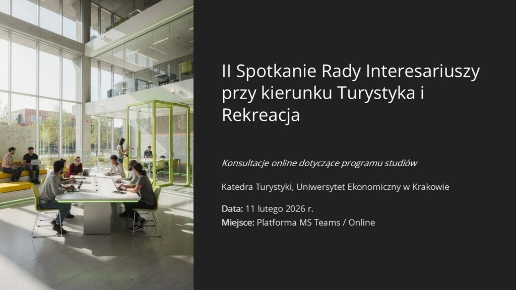 W dniu 11.02.2026 r. odbyło się drugie (tym razem zdalne) posiedzenie Rady Interesariuszy Katedry Turystyki, poświęcone zaopiniowaniu zmian w programie studiów I i II stopnia na kierunku Turystyka i Rekreacja. Konieczność wprowadzenia modyfikacji wynika z dostosowania programu do przepisów ustawy Prawo o szkolnictwie wyższym i nauce oraz zarządzenia Rektora UEK, a także z wymogów Polskiej Komisji Akredytacyjnej, która zobowiązuje uczelnie do konsultowania programów studiów z otoczeniem społeczno-gospodarczym.