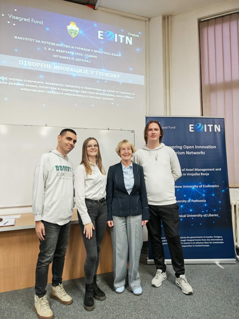 W dniach 3–4 lutego 2026, wraz z Profesorem Krzysztofem Borodako, uczestniczyliśmy w spotkaniu zorganizowanym w ramach projektu Empowering Open Innovation Tourism Networks, finansowanego przez Międzynarodowy Fundusz Wyszehradzki. Podczas tego wydarzenia miałam przyjemność podzielić się z naszymi Partnerami: Wydziałem Zarządzania Hotelarstwem i Turystyką w Vrnjačkiej Bani Uniwersytetu w Kragujevacu, Politechniką w Libercu, Uniwersytetem Panońskim oraz interesariuszami z Vrnjačkiej Bani doświadczeniami z Krakowa (KRAKÓW NETWORK 2.0), w formie wykładu zatytułowanego: Współpraca w turystyce oparta na innowacjach – przykład Krakowa.