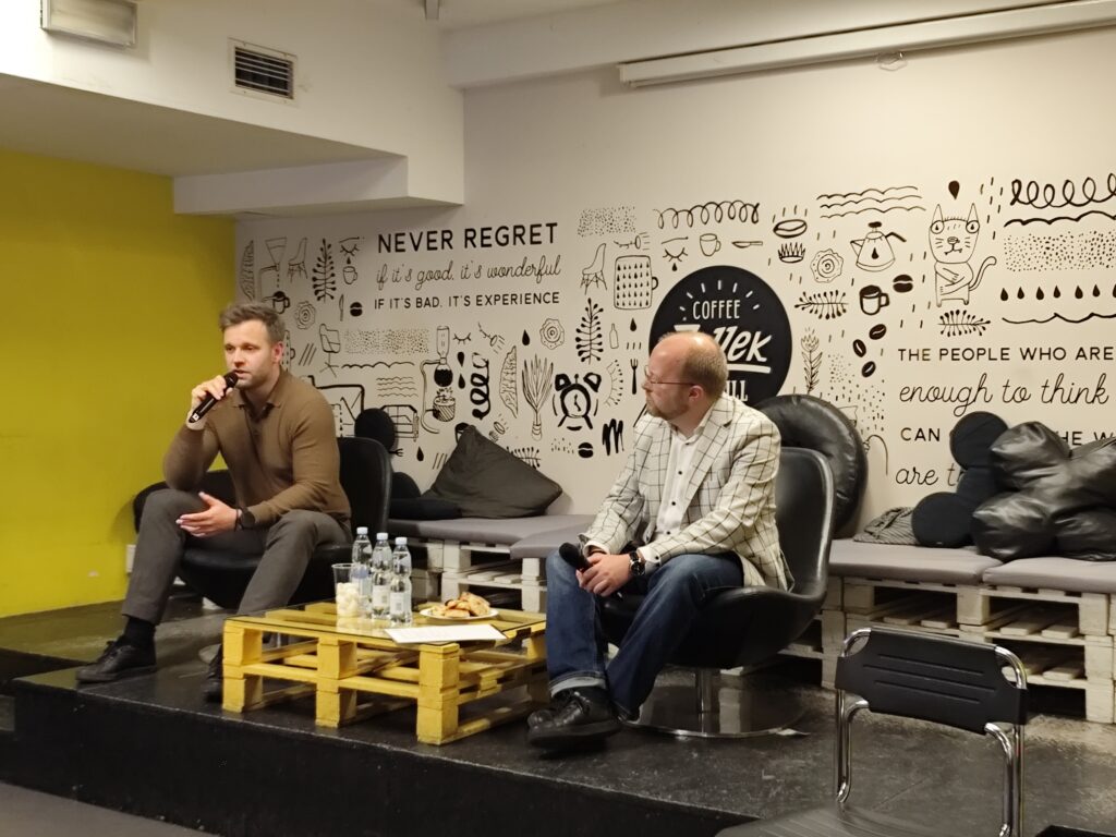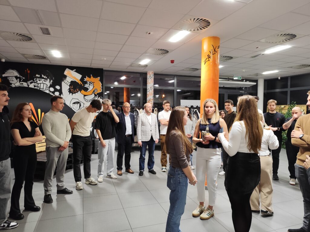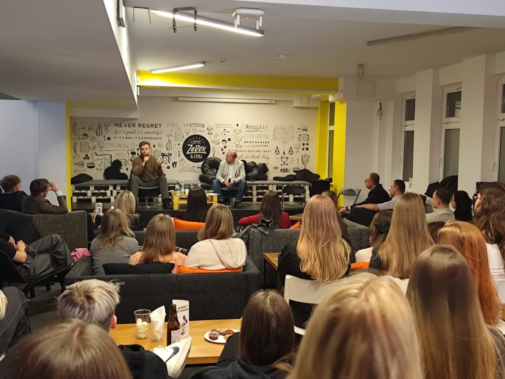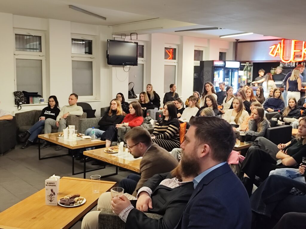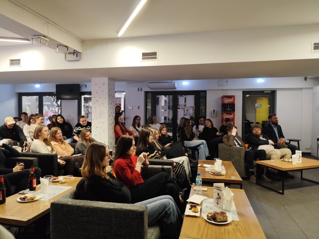 We wtorek 18.11.2025 w klubie studenckim ZaUEK odbyła się impreza integracyjna studentów kierunku Zarządzanie Międzynarodowe, podczas której na naszych studentów czekała moc atrakcji. Po krótkim otwarciu spotkania przez prof. Krzysztofa Machaczkę, mogliśmy zapoznać się z historią naszego gościa specjalnego – absolwenta specjalności Zarządzanie Międzynarodowe, przedsiębiorcy Marcina Piątkowskiego. W wywiadzie prowadzonym przez dr Piotra Sedlaka usłyszeliśmy wiele cennych refleksji Pana Marcina na temat jego studiów i kariery zawodowej z perspektywy czasu. Nie sposób pokrótce opisać wszystkich doświadczeń, których rąbka tajemnicy uchylił nam nasz gość, dlatego pozwolę sobie podsumować to kilkudziesięciominutowe wystąpienie następującą konstatacją: